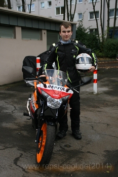 Ich habe seit 2013 den Führerschein fürs Motorrad und bin sehr stolz, eine kleine Honda Repsol zu fahren! Es macht auch richtig Spass.